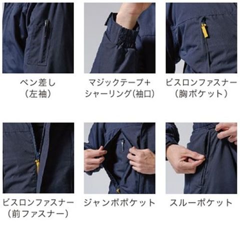 | 左袖ペン差し、袖口マジックテープ+シャーリング、ビブロンファスナー、スルーポケット |