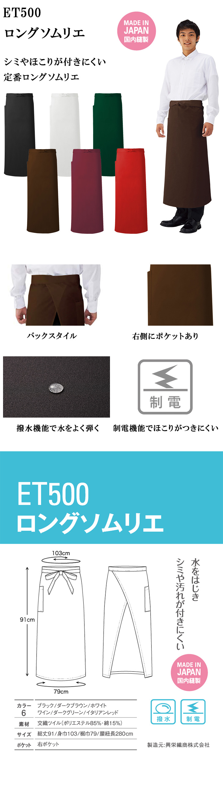 【メール便対応】エプロン 前掛 制服 ユニフォーム ロング丈 長め 興栄繊商 KOEI ロングソムリエ LET500、LET500-WI、LET500-GR、LET500-RE 飲食店 ユニフォーム カフェ レストラン バー 居酒屋 ソムリエ おしゃれ かわいい 可愛い かっこいい
