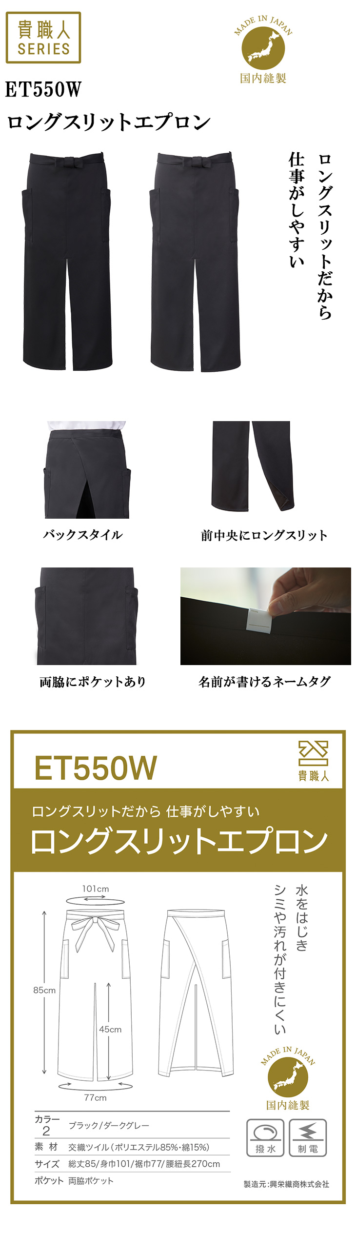 【メール便対応】エプロン 前掛 制服 ユニフォーム ロング丈 長め 興栄繊商 KOEI ロングスリットエプロン LET550W-BK、LET550W-GY 飲食店 ユニフォーム カフェ レストラン バー 居酒屋 ソムリエ おしゃれ かわいい 可愛い かっこいい