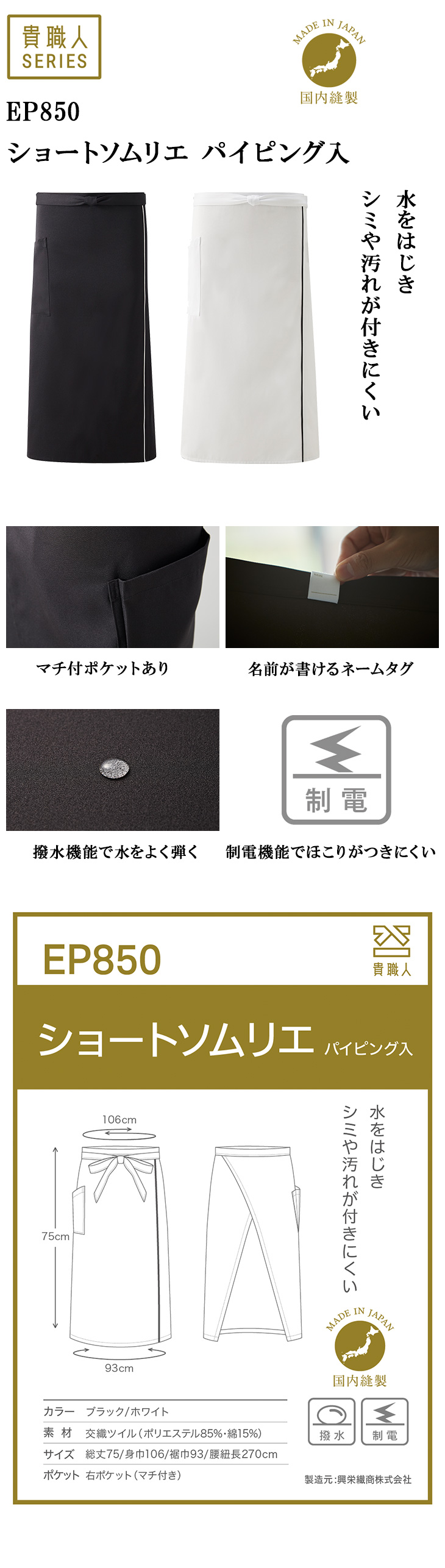 【メール便対応】エプロン 前掛 制服 ユニフォーム ロング丈 長め 興栄繊商 KOEI ショートソムリエ パイピング入 EP850-BK、EP850-WH 飲食店 ユニフォーム カフェ レストラン バー 居酒屋 ソムリエ おしゃれ かわいい 可愛い かっこいい