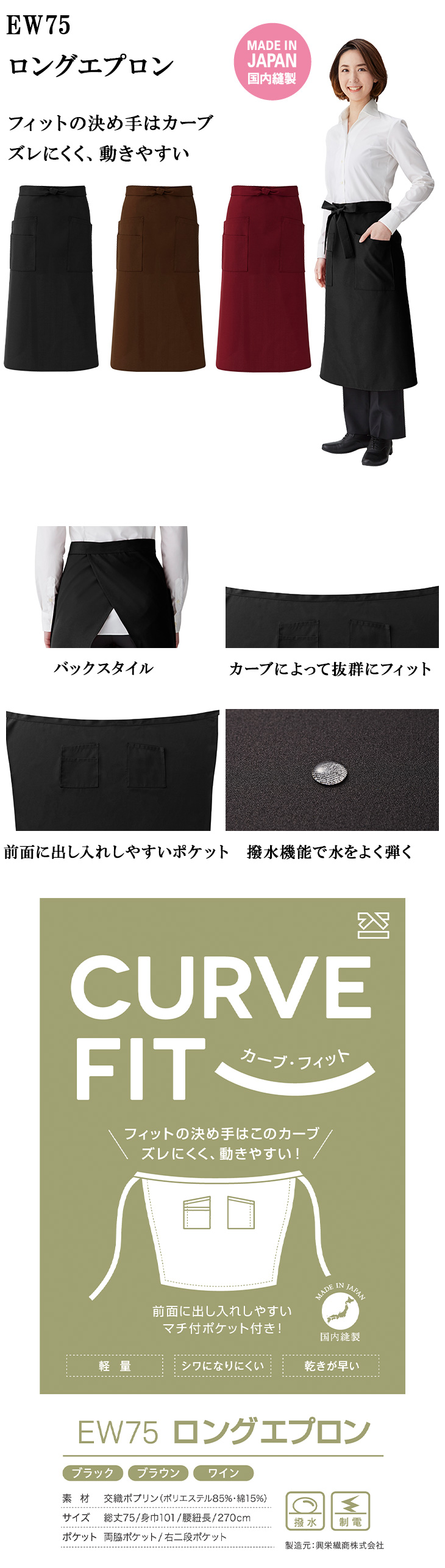 【メール便対応】エプロン 前掛 制服 ユニフォーム ロング丈 長め 興栄繊商 KOEI ロングエプロン EW75-BK、EW75-BR、EW75-WI 飲食店 ユニフォーム カフェ レストラン バー 居酒屋 ソムリエ おしゃれ かわいい 可愛い かっこいい