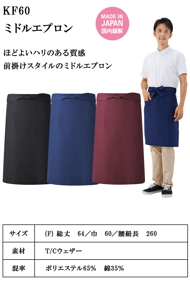 【メール便対応】エプロン 前掛 制服 ユニフォーム ミドル丈 興栄繊商 KOEI ミドルエプロン KF60-BK、KF60-NB、KF60-EG 飲食店 ユニフォーム カフェ レストラン バー 居酒屋 ソムリエ おしゃれ かわいい 可愛い かっこいい
