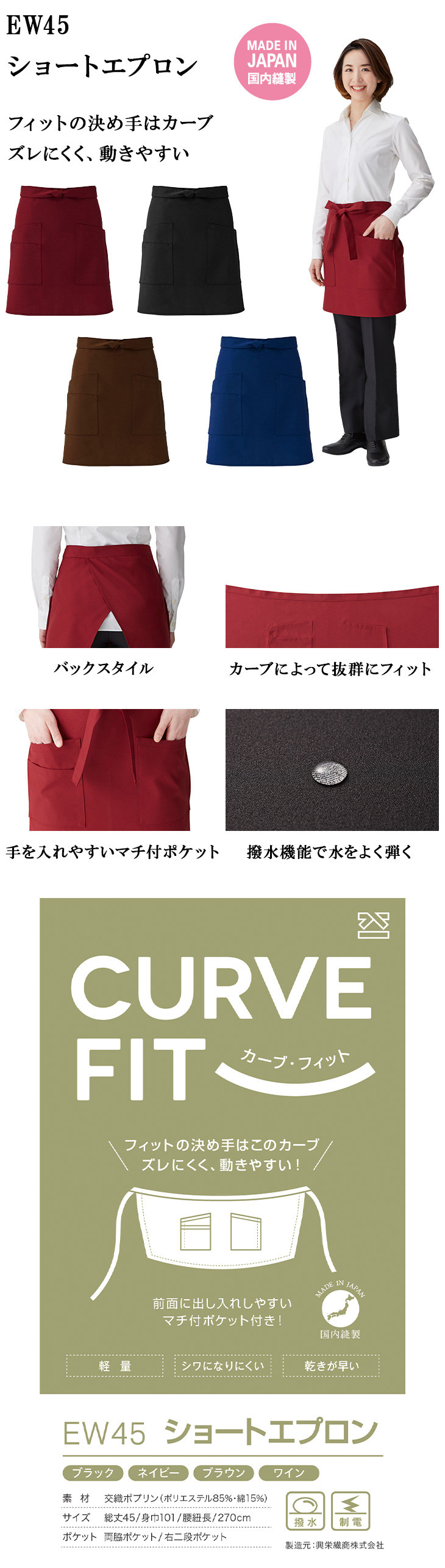 【メール便対応】エプロン 前掛 制服 ユニフォーム ショート丈 短め 興栄繊商 KOEI ショートエプロン EW45-BK、EW45-NB、EW45-BR、EW45-WI 飲食店 ユニフォーム カフェ レストラン バー 居酒屋 ソムリエ おしゃれ かわいい 可愛い かっこいい