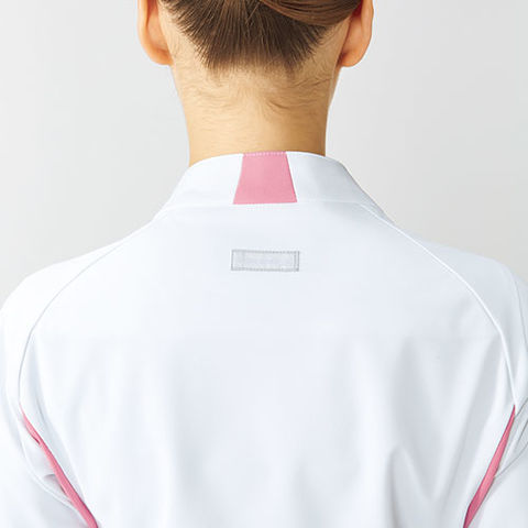 白衣に求められる、薄さと透けにくさを両立させた高機能素材シルキートリコットのジャケット。後ろ襟を高めに設定して、ネックトラップが肌へ直接当たらないようにデザインしています。