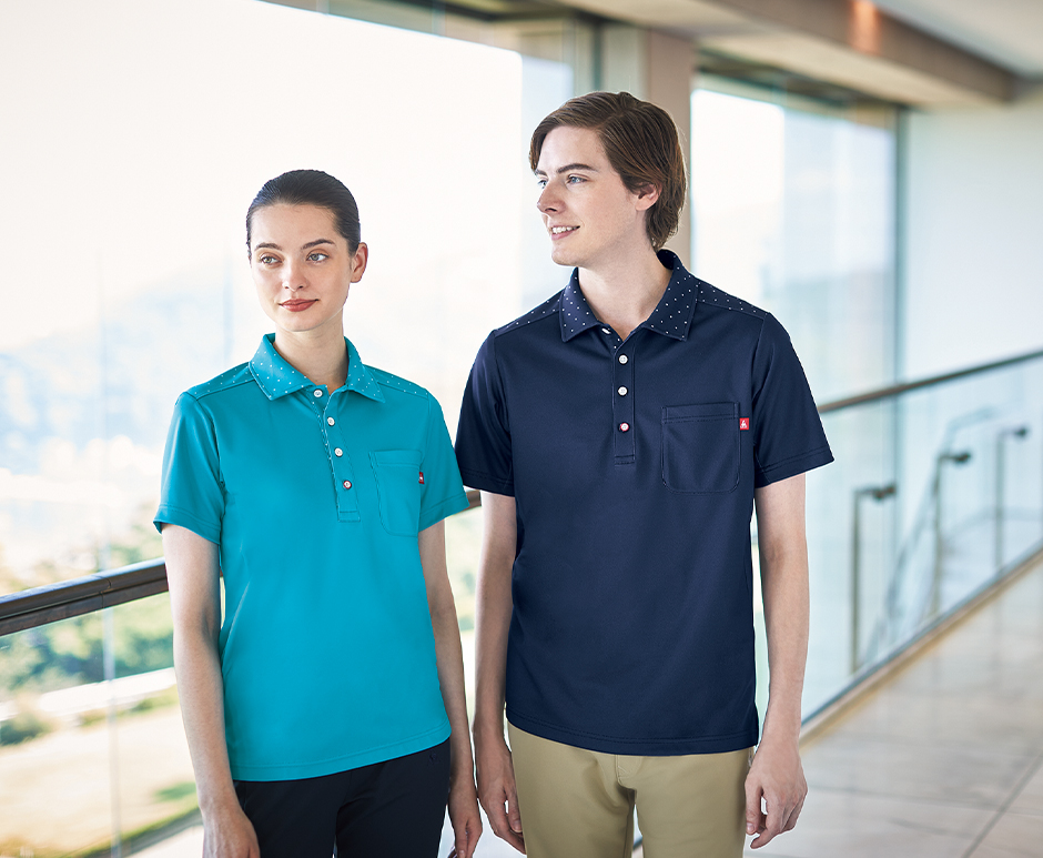 | ・背面ポケット(右) 背面にポケットを設置することで、介護作業を妨げず必要な物を収納。ロゴ刺繍がオシャレポイント。 ・バックスタイル うしろ襟の下部に、トリコロールテープを取り付けバックスタイルの美しさをつくるとともに、デザイン性をプラスしました。 ・前立てアクセント配色 下前立て部分にはドット柄の切り替えで、さりげなくオシャレに。 ・ロゴ入りボタン ロゴ入りのかわいいボタンを使用。4つボタンの1つをレッドのカラーで配色し、さりげないアクセントになっています。 |