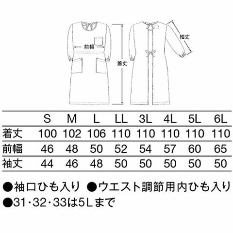 | ●袖口ひも入り●ウエスト調節用内ひも入り●31・32・33は5Lまで |