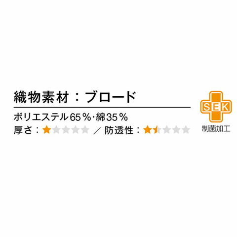 | 織物素材:ブロードポリエステル65%・綿35% 厚さ★☆☆☆☆/ 防透性 ★ ☆☆☆ |