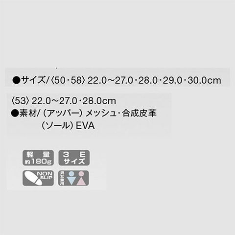 ●サイズ〈/50・58〉22.0~27.0・28.0・29.0・30.0cm●しゃがんだり走ったり、あらゆる動作に対応するマルチソールを採用。どんなシーンの床でもすべりにくい特別ソール。●かかと部分の内部には衝撃吸収材を装備。●側面にメッシュを採用しムレを軽減。●かかと部分は内側に倒れるので、足をすべり込ませて簡単に履けます。