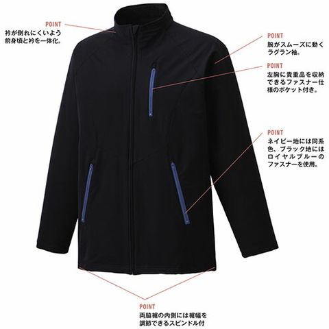 | ●両腰ポケット付。●左胸に貴重品を収納できるファスナー仕様のポケット付。●衿が倒れにくいよう前身頃とを一体化。●腕がスムーズに動くラグラン袖。●ネイビー地には同系色、ブラック地にはロイヤルブルー、バーガンディーにはグレーのファスナーを使用。●両脇裾の内側には裾幅を調節できるスピンドル付。●人に当たらないようファスナーのテープは裏使い。●衿上とポケット口には、ファスナーの引き手が収まるカバー付。 |