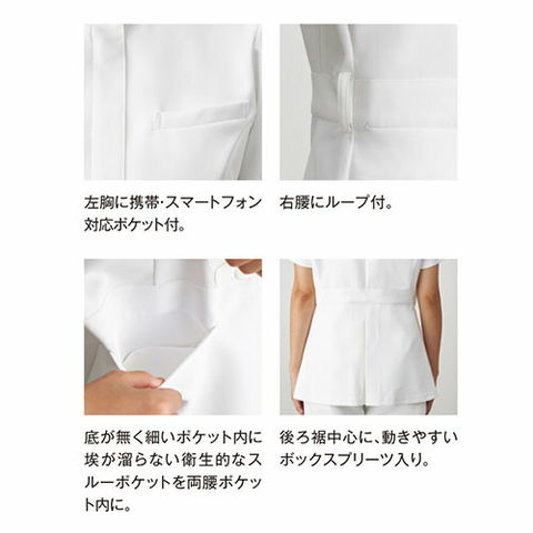 | ●左胸に携帯・スマートフォン対応ポケット付●両腰ポケットに内ポケット付●右腰にループ付●底が無く、細いポケット内に埃が溜らない衛生的なスルーポケットを両腰の内ポケットに。●後ろ裾中心に、動きやすいボックスプリーツ入り●後ろ姿も美しく見えるよう、シルエットにこだわりました |