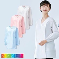 | 厨房に白が冴えるKAZENの調理衣。水仕事に便利な袖口ゴム入りがうれしいポイント。比翼仕様です。 |