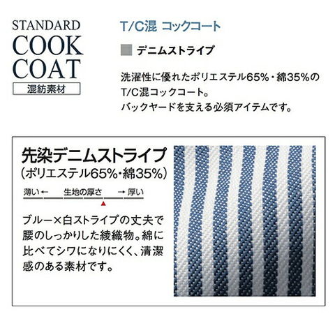 | デニムストライプ柄コックコートのダブルタイプ。耐洗濯性に優れており、バックヤードを支える必須アイテムです。ブルー×白ストライプの丈夫でコシのしっかりした綾織物。綿に比べてシワになりにくく、清潔感のある素材です。組み紐ボタンを使用しています。 |