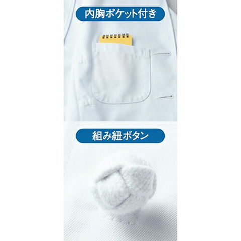| ベーシックコートのダブルタイプ。綿100%の葛城素材を使用した安心の定番スタイルです。太い糸を使った厚地の綿の綾織物。吸汗性に優れ肌触りがよく、漂白効果に優れています。組み紐ボタンを使用しています。 |