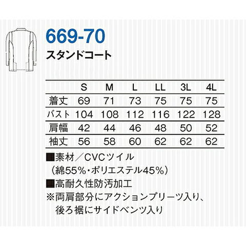 制服 ユニフォーム シェフ KAZEN カゼン スタンドコート 669-70 長袖 飲食店 厨房服 調理服 コック服 レストラン フレンチ イタリアン 中華 おしゃれ かわいい かっこいい プロ仕様 吸汗 快適 制電 汚れにくい