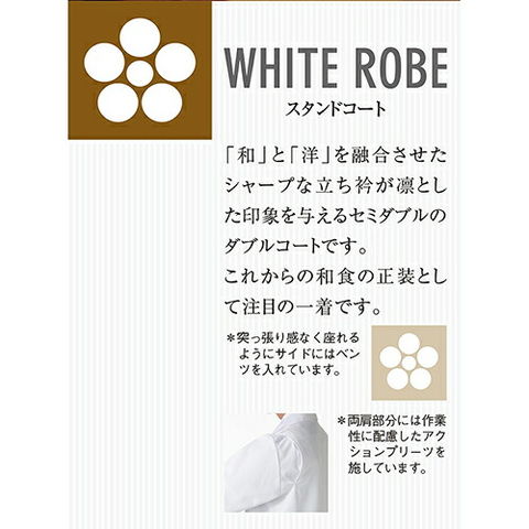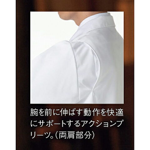 | 和と洋を融合させたシャープな衿が凛とした印象。ウェアに表情を与えるフロント部分の切り替えデザインが特長です。腕を前に伸ばす動作を快適にサポートするアクションプリーツ入り(両肩部分)。第一ボタンはテーピースナッパー留めで第二ボタンは比翼ボタン仕様となっております。 |