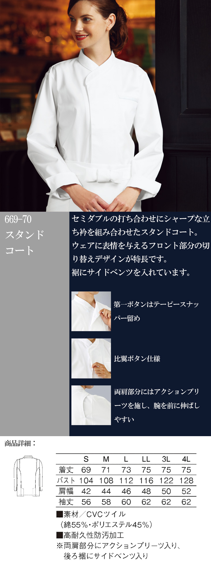 制服 ユニフォーム シェフ KAZEN カゼン スタンドコート 669-70 長袖 飲食店 厨房服 調理服 コック服 レストラン フレンチ イタリアン 中華 おしゃれ かわいい かっこいい プロ仕様 吸汗 快適 制電 汚れにくい
