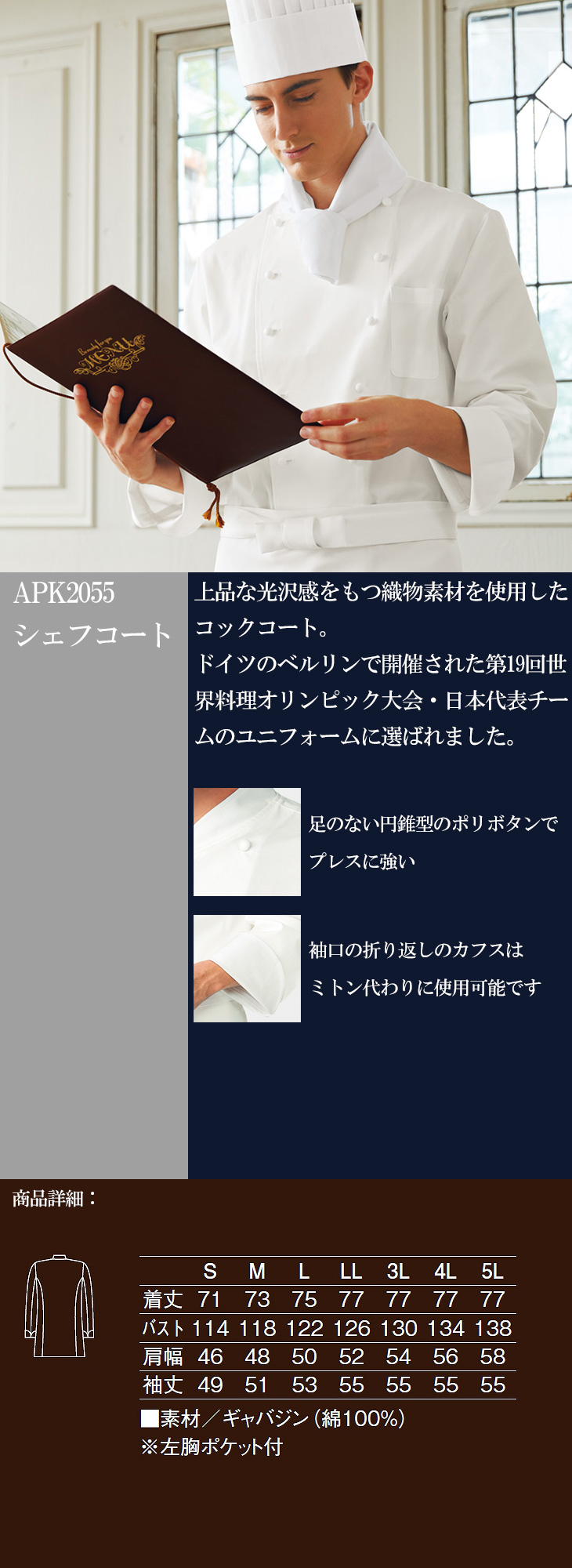 制服 ユニフォーム シェフ KAZEN カゼン 男子シェフコート 長袖 APK2055 飲食店 厨房服 調理服 コック服 レストラン フレンチ イタリアン 中華 おしゃれ かっこいい プロ仕様 上品 綿 コットン 吸汗 快適