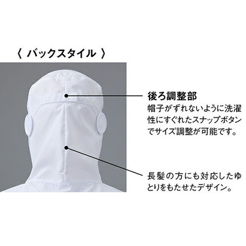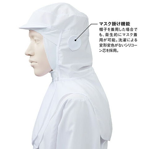帽子は動くのを防ぐために洗濯性に優れたスナップボタンで調節が可能で額部も固定されます。長髪の方にも対応したゆとりをもたせたデザインです。ケープ部分は暑さの原因につながる余分な分量をカットし、肩に合わせた立体的なパターンです。衛生的にマスク着用が可能であるマスク掛け機能の部分は帽子のつばと同じくシリコーン芯を使用しているので洗濯による変形などの心配がありません。