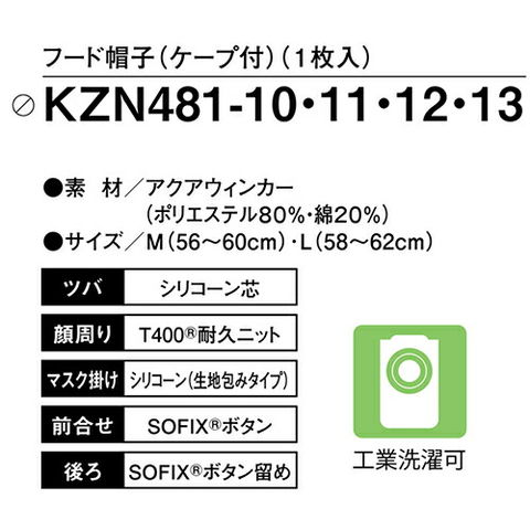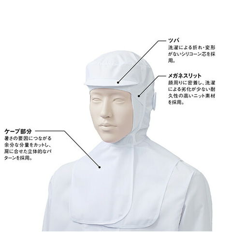| 帽子は動くのを防ぐために洗濯性に優れたスナップボタンで調節が可能で額部も固定されます。長髪の方にも対応したゆとりをもたせたデザインです。ケープ部分は暑さの原因につながる余分な分量をカットし、肩に合わせた立体的なパターンです。衛生的にマスク着用が可能であるマスク掛け機能の部分は帽子のつばと同じくシリコーン芯を使用しているので洗濯による変形などの心配がありません。サイズはM(56~60cm)、L(58~62cm)があります。 |