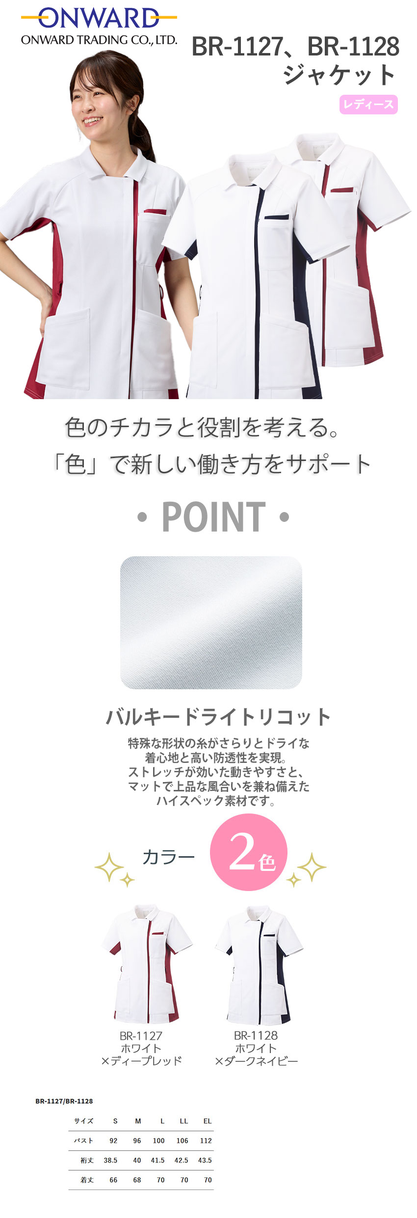 ケーシー 白衣 ジャケット 横掛 BR-1127・1128 オンワード ONWARD ラフィーリア 医療 襟なし レディース 女性用 半袖 医師 医者 女医 看護師 ナース 医療用 病院 外科 人気 医務衣 診察衣 接触冷感 帯電防止 速乾 かわいい おしゃれ 通販