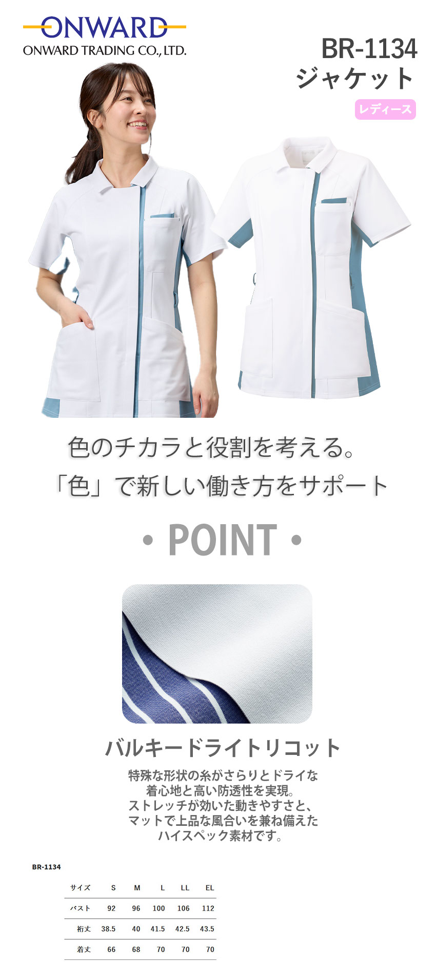 ケーシー 白衣 ジャケット 横掛 BR-1134 オンワード ONWARD ラフィーリア 医療 治療 襟なし レディース 女性用 半袖 医師 医者 看護師 ナース 医療用 病院 クリニック 作業療法 人気 上衣 医務衣 診察衣 ストレッチ 可愛い かわいい おしゃれ