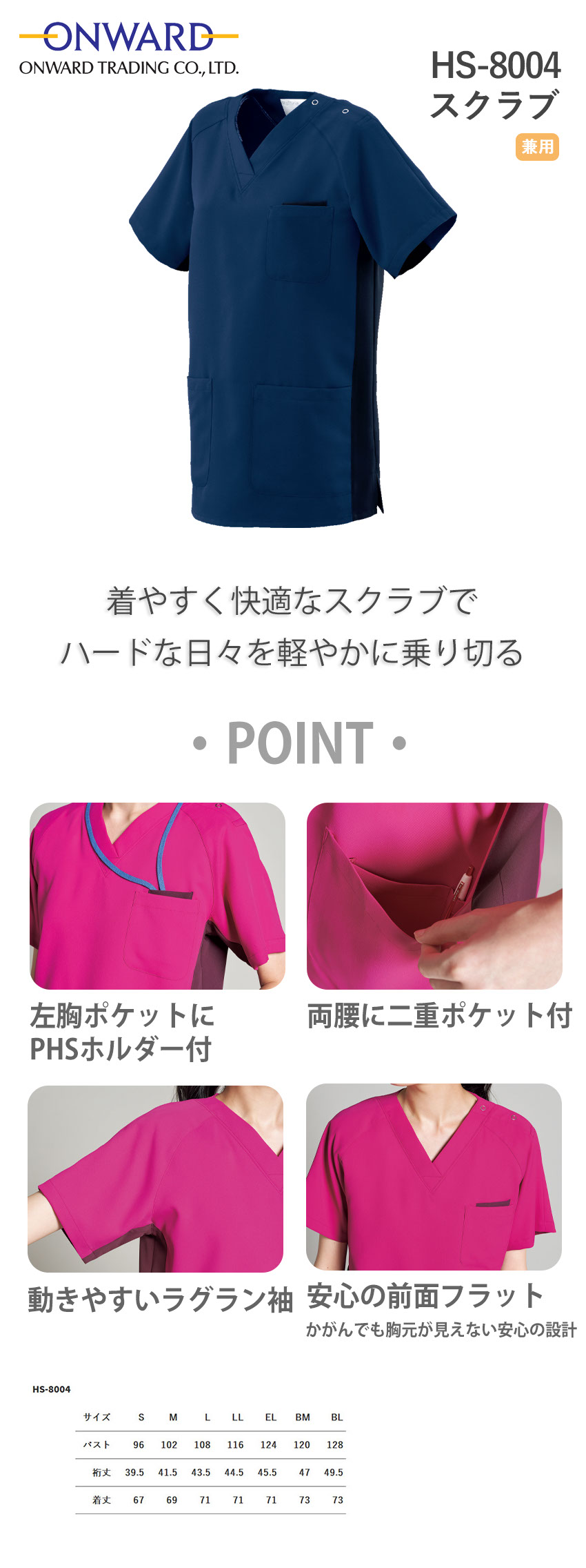 【メール便対応】スクラブ 白衣 医療 HS-8004 オンワード ONWARD ラフィーリア ユニセックス 男女兼用 半袖 医者 看護師 ナース 研修医 医療 人気 制服 ユニフォーム 速乾 病院 小児科 介護 可愛い かわいい かっこいい おしゃれ 動きやすい