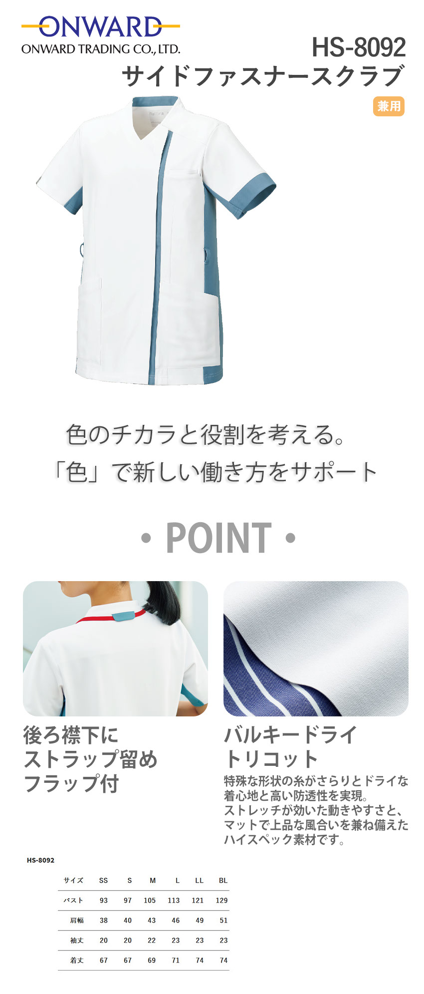 サイドファスナースクラブ 白衣 医療 HS-8092 オンワード ONWARD ラフィーリア ユニセックス 男女兼用 半袖 医者 看護師 ナース 研修医 医療 人気 制服 ユニフォーム 丈夫 病院 歯医者 介護 可愛い かわいい かっこいい おしゃれ