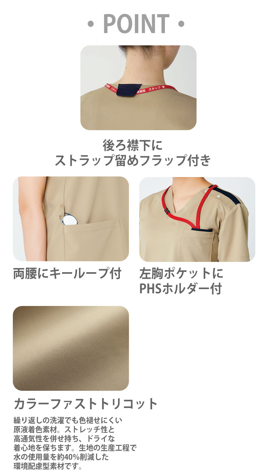 | ●後ろ襟下にストラップ留めフラップ付き●左胸ポケットにPHSホルダー付き●両腰にキーループ付き |