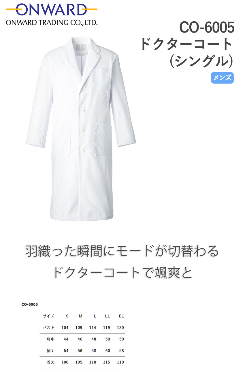ドクターコート 白衣 診察衣 メンズ 男性用 CO-6005 オンワード ONWARD ラフィーリア 医師 薬剤師 医療 制服 ユニフォーム 病院 ロング丈 名入れ おしゃれ かっこいい 軽量 工業洗濯対応 丈夫 シンプル おすすめ 人気