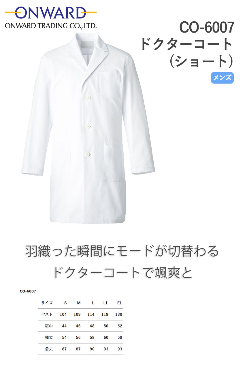 ドクターコート 白衣 診察衣 メンズ 男性用 CO-6007 オンワード ONWARD ラフィーリア 医師 薬剤師 医療 制服 ユニフォーム 病院 ショート丈 短め 名入れ おしゃれ かっこいい 速乾 乾きやすい 動きやすい おすすめ 人気