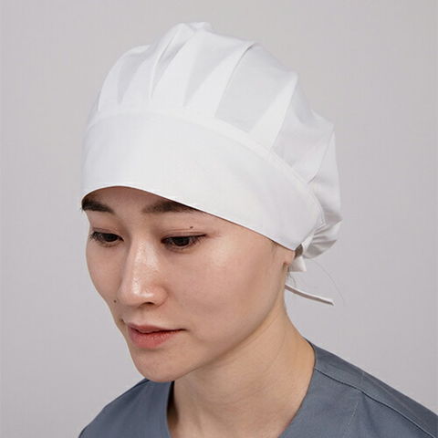 | 物作りに精通している人が接客する、というシーンにあう帽子です。ひさしも無いので目を合わせての接客がしやすいところもポイントです。後ろゴム入り、調整紐付き。制菌加工付き。 |