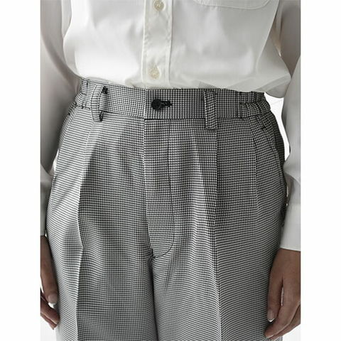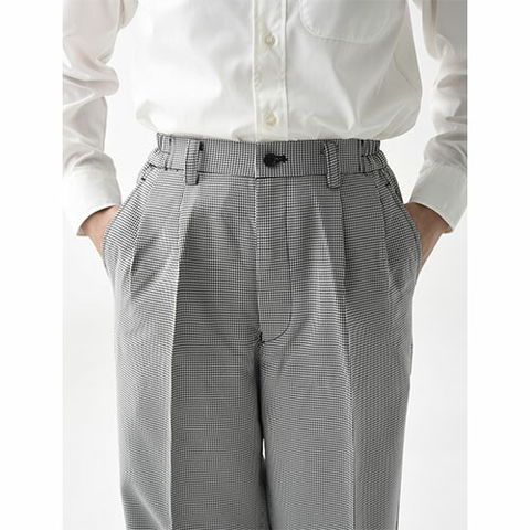 | 男女兼用キャンティーンパンツです。ツータック、脇ゴム仕様ですのでゆったりと着心地はとても楽、快適に仕事が出来ます。しっかりした生地の千鳥格子柄、耐久性も高い商品です。 |