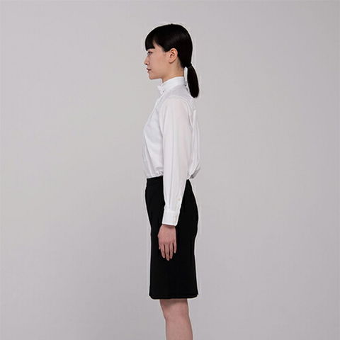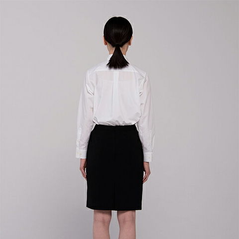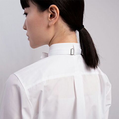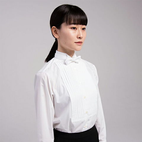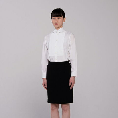 | フォーマルシャツ。ウイングカラー、プリーテッド・ボザム(胸部分にプリーツある)ディティールが特徴。毛混のタキシードやジャケット等と合わせてフォーマルよりのサービスシーンにオススメです。襟の後ろ中心にチョウタイをした際に外れないようループがあります。肩ヨークは生地が斜めに裁断されていますので、多少の伸びを感じ着心地の良さを配慮したものになっています。生地はポリエステル混ですが綿の風合いがしっかりある良い素材。女性用。 |