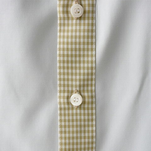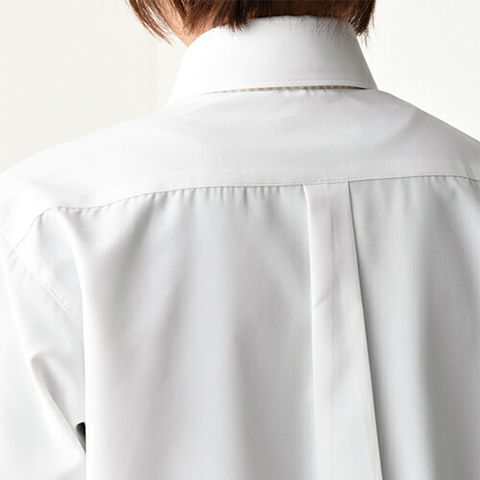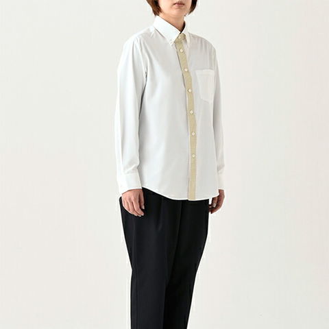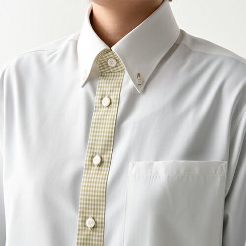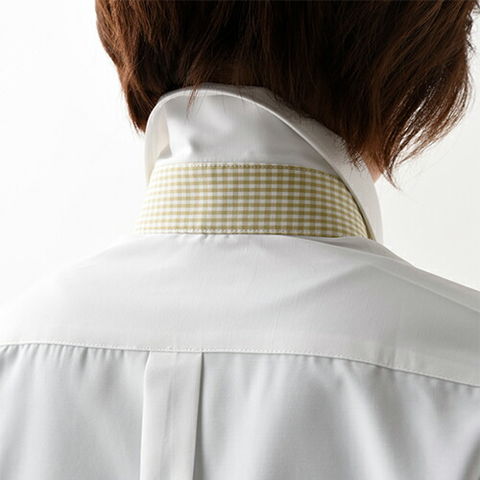 | 洗濯性に優れ、かつシルクの様な風合いのシャツです。綿とは違う上質な着心地を得ることが出来ます。前立てと襟裏にギンガムチェックの別布を配しデザインポイントになっています。襟裏のギンガムチェックは汚れが目立ちにくいという利点もあります。他は左胸にポケットがあるシンプルなデザインです。ギンガムチェックが印象的なデザインですので、少しカジュアルなサービスシーンにオススメです。男女兼用、長袖。透け防止、UVカット機能あり。 |