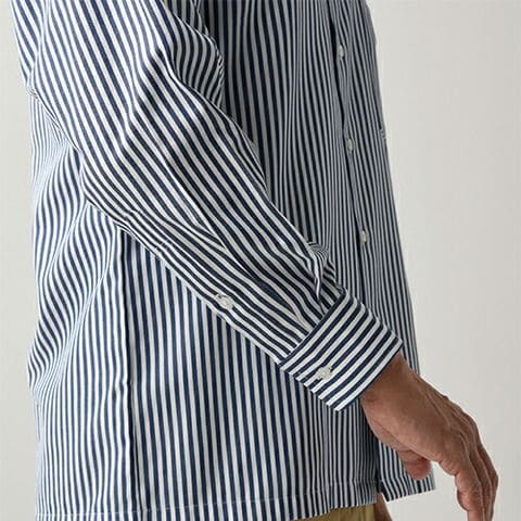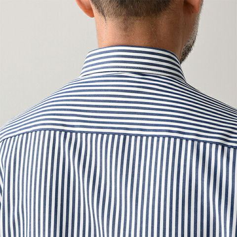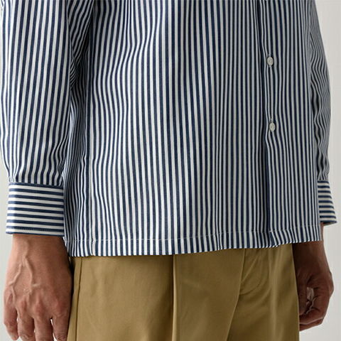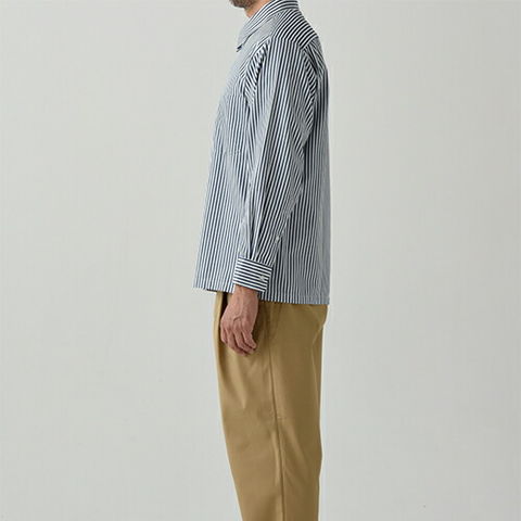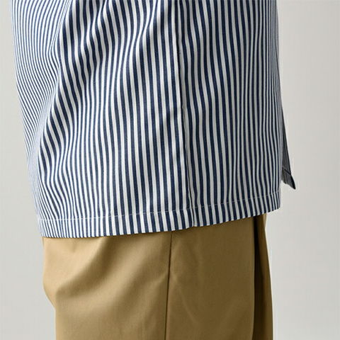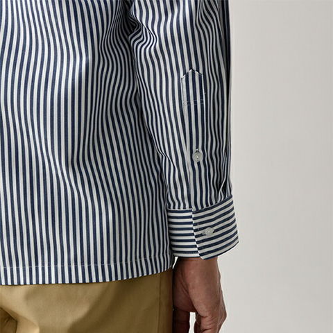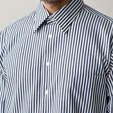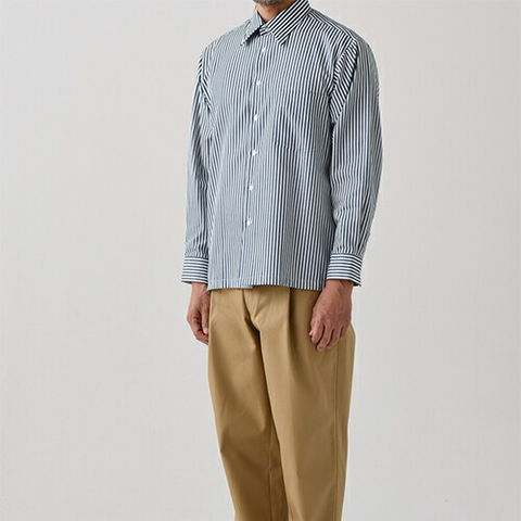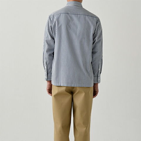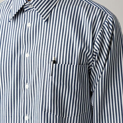 通常シャツには使わない、厚手の先染めデニムを使用したワークディテールのストライプシャツ。青いストライプが人気のロングセラー商品です。