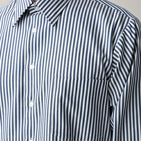 | ストライプのデニム生地で作成されたシャツです。写真からのイメージより生地はしっかりと厚いものになっており、またポリエステル混ながらかなり綿風合いがしっかりあるカジュアルな生地というところも特徴です。デザインは左胸ポケットありのプレーンなものですのでコーディネートしやすいアイテムです。カフェ、花屋さんなど幅広く使用されているユニフォームストライプデニムシャツです。 |