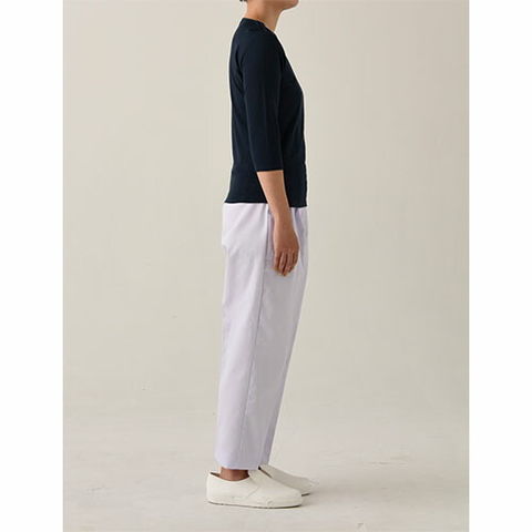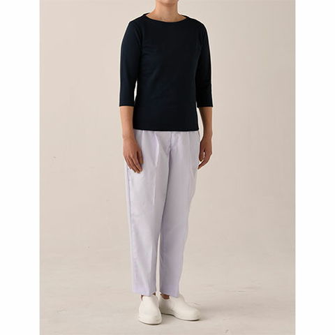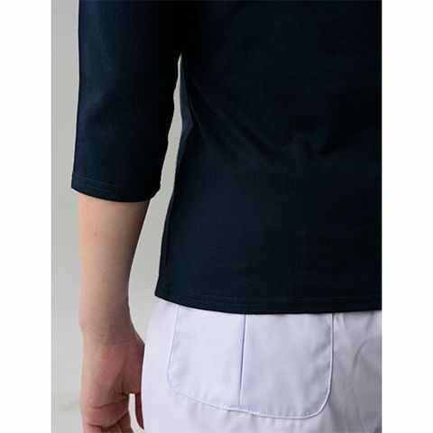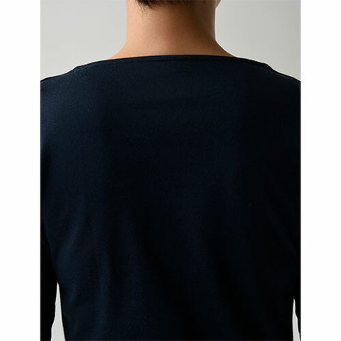 | 綿ポリエステル天竺で作られたボートネックシャツ。ジャージーですので適度なストレッチはあります。主にスーツのインナーやきれいめエプロンなどを合わせると素敵なサービスシーンを演出できます。前見頃が2枚仕立てなので透けにくく、ボートネックラインはインナーの肩ひもなどが見えないような襟ぐりなどユニフォームとしてのデザインになっています。7分袖。女性用。 |