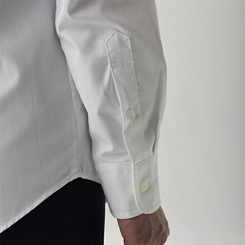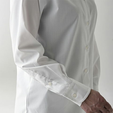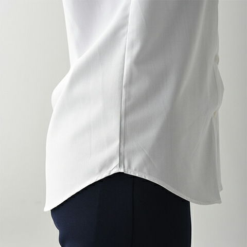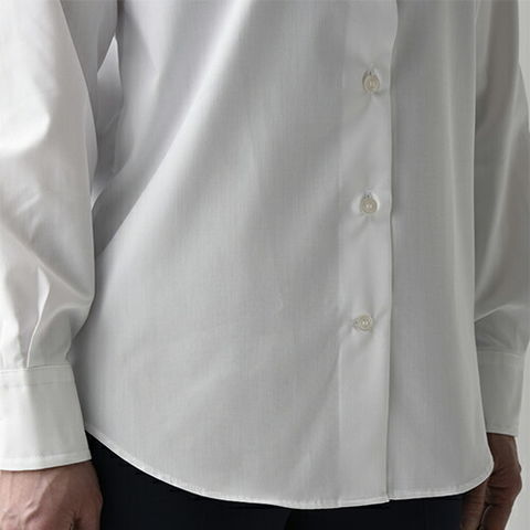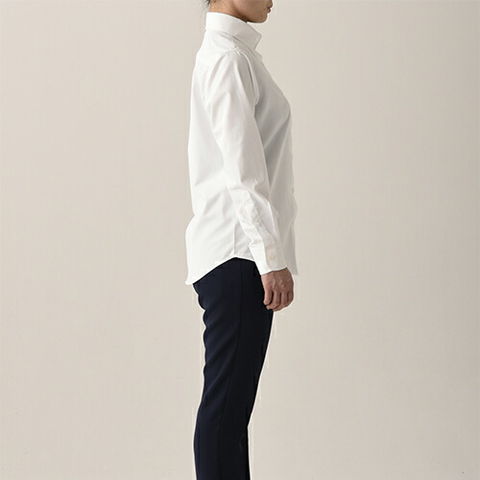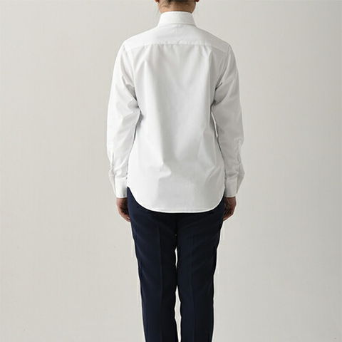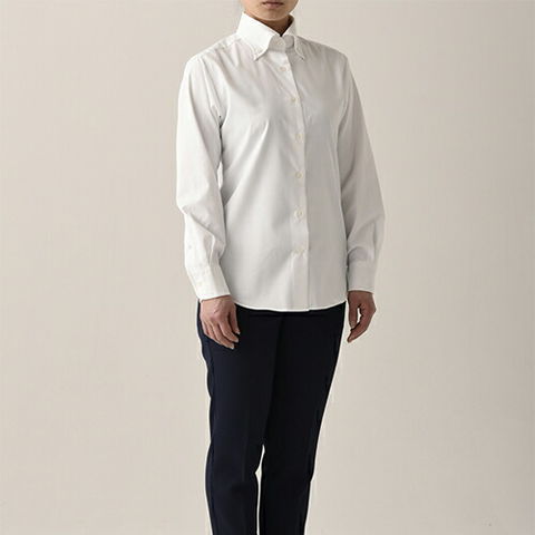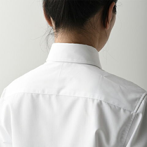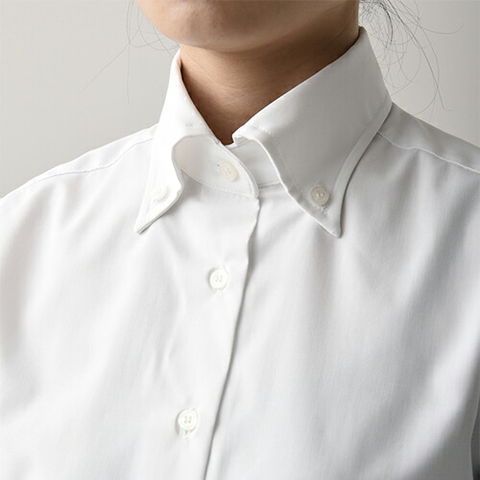 | スーツと合わせるボタンダウンシャツとして開発。ネクタイを結ぶと映える襟です。前立てなし、ポケット無しのシャツです。生地は通気の良い素材で、吸水速乾性あり、透けにくく、UVカット機能もある多機能シャツです。女性用。 |