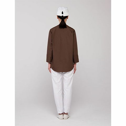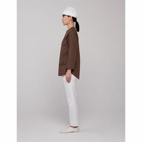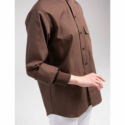 | セブンユニフォーム定番のシャツ生地に抗ウイルスの機能を追加したブラッシュアップ素材を使用。強度と安心感を両立しました。袖口にアンダーカバーを配したHACCP対応商品。ノーカラー、ワーキングディティールを取り入れつつすっきりとした印象を与える8部袖シャツ。 |