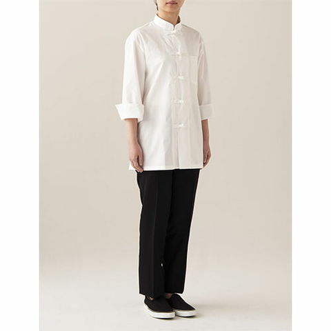| 通気の良いヘアコード生地を使用し軽くて涼しいコートです。組紐でのチャイナ風ボタンがとても個性的です。袖はカフス折り上げて7分袖。デザイン性が高いのでシェフはもちろん、サービスコートとしてもオススメです。 |