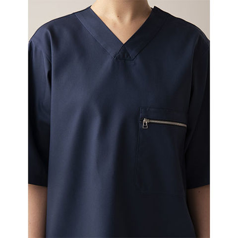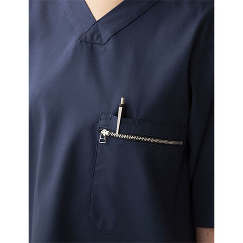 ペン差しポケット、肩スナップボタン留、裾スリット、ペン差し用ホール付ポケット