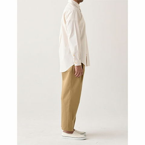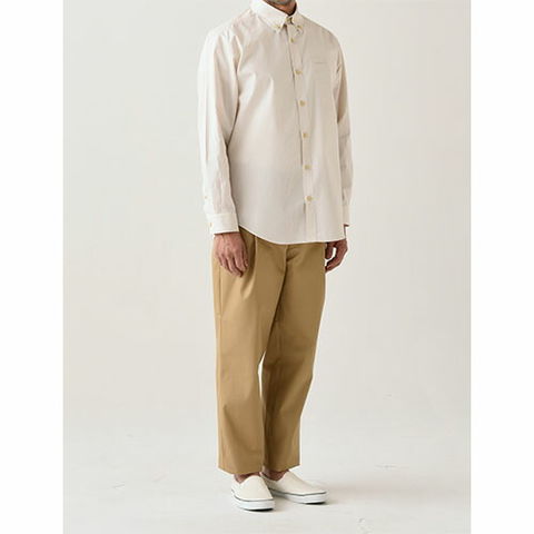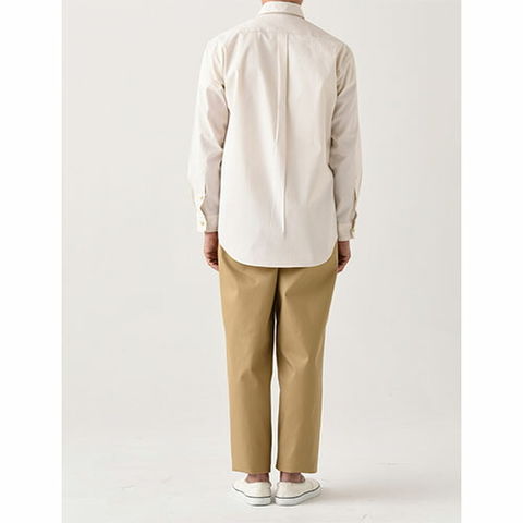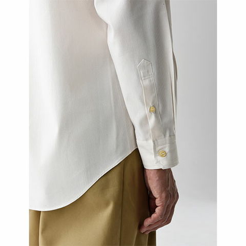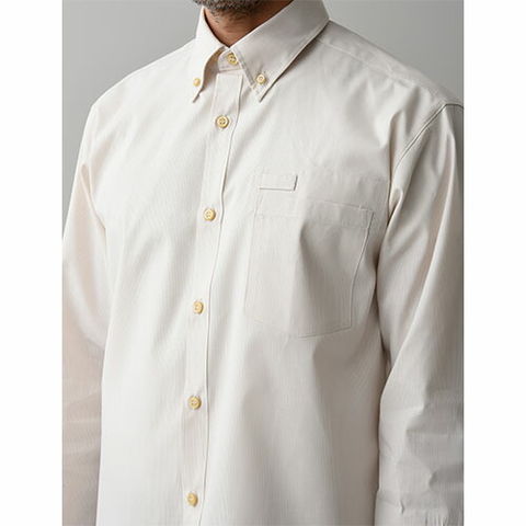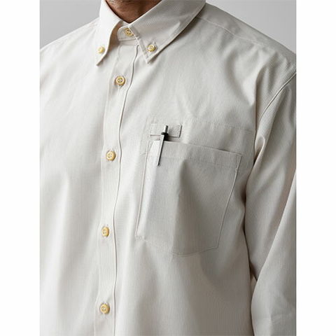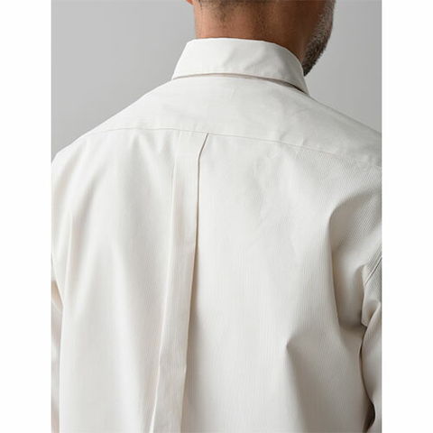 コードレーン生地とは、縦方向に細かい畝が表れた白とカラーの組み合わせによる細かいストライプ柄。細かい柄がゆえに一見すると1色に見えるところがいい。それにより誰もが抵抗なく着用でき、かつ生地の表情があることで価値を感じる生地になっています。ボタンが生地に対して少し濃色なところだったり、ネームチーがあったり、胸ポケット口の補強布が施されていたりとユニフォームシャツとしての必要なディティールがしっかりあるサービスシャツになっています。接客販売からレストランサービス、またはアミューズメントスタッフまでと幅広いデザインシャツとして使われています。BD襟、長袖、男性用。