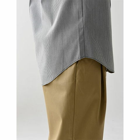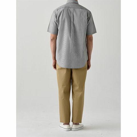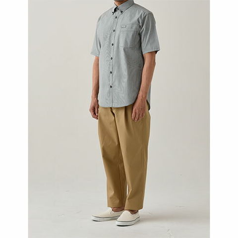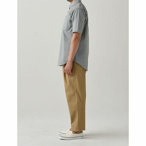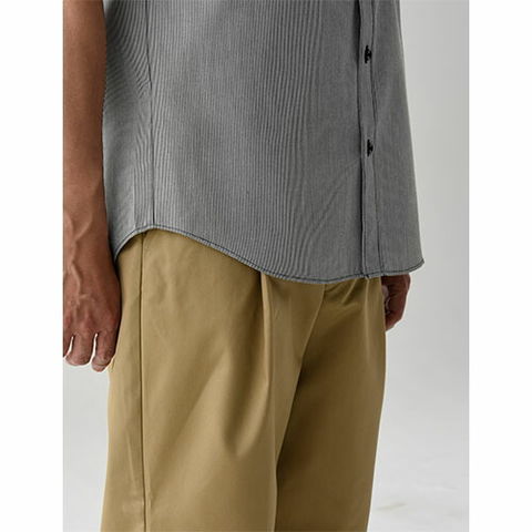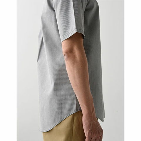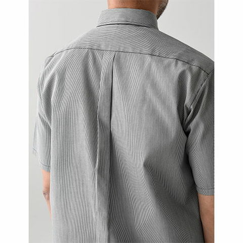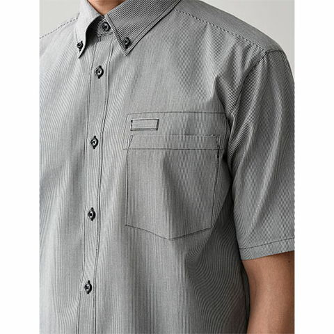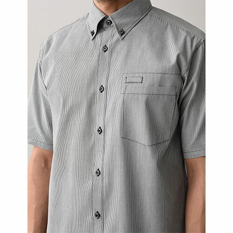 | コードレーン生地とは、縦方向に細かい畝が表れた白とカラーの組み合わせによる細かいストライプ柄。細かい柄がゆえに一見すると1色に見えるところがいい。それにより誰もが抵抗なく着用でき、かつ生地の表情があることで価値を感じる生地になっています。ボタンが生地に対して少し濃色なところだったり、ネームチーがあったり、胸ポケット口の補強布が施されていたりとユニフォームシャツとしての必要なディティールがしっかりあるサービスシャツになっています。接客販売からレストランサービス、またはアミューズメントスタッフまでと幅広いデザインシャツとして使われています。BD襟、半袖、男性用。 |