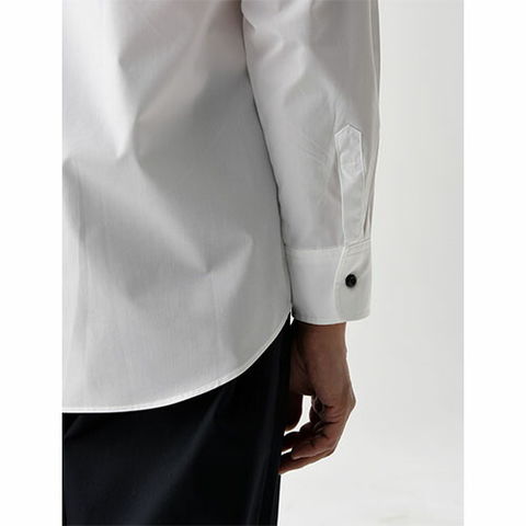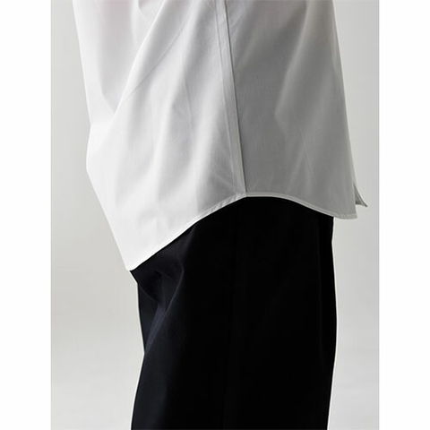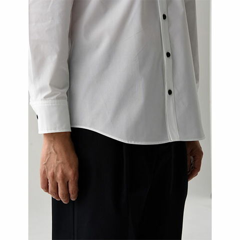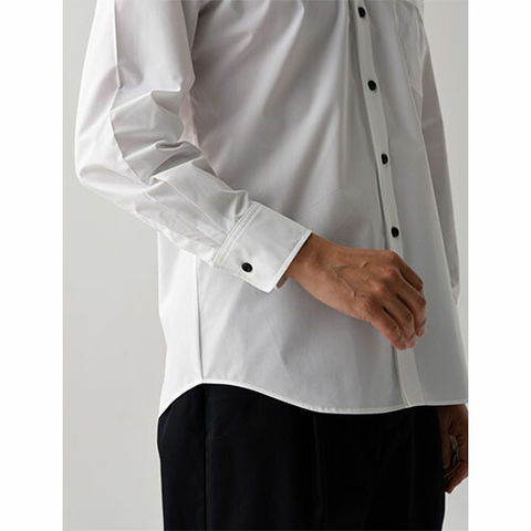 台襟ボタンがないことで、開放感のある「スキッパーカラー」。その特長を活かしながら、ホスピタリティを表現するためカッティングにもこだわっています。美しいサービスに合う、リラックス感のある襟元です。