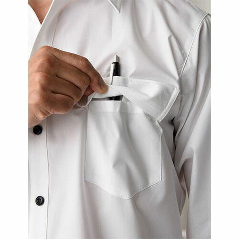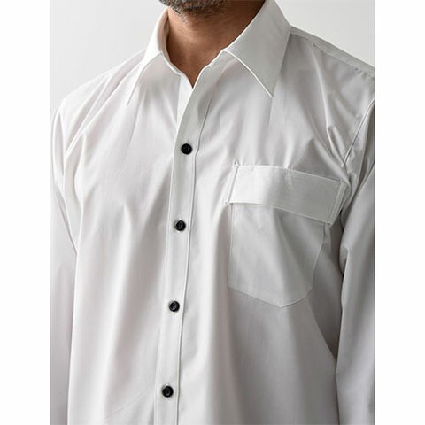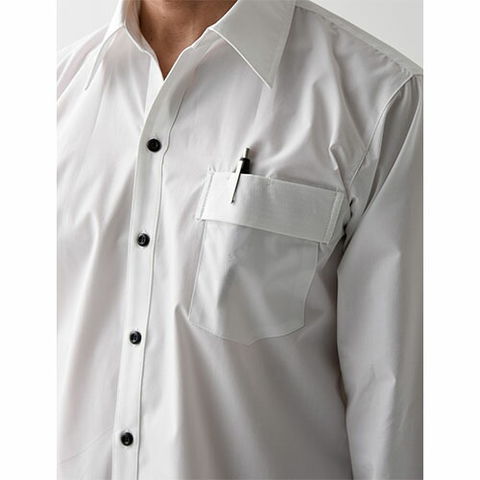| 胸元が大きく開くスキッパーカラーが特徴です。ボタンの色が黒蝶だったりと、とてもユニフォームらしいアイテムです。人気あるロングセラー商品です。主にカフェやレストランで着用されている姿をよく見かけます。胸ポケットにはペン刺し、またはネームを挟みやすい仕様になっております。男性用、長袖。 |