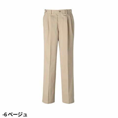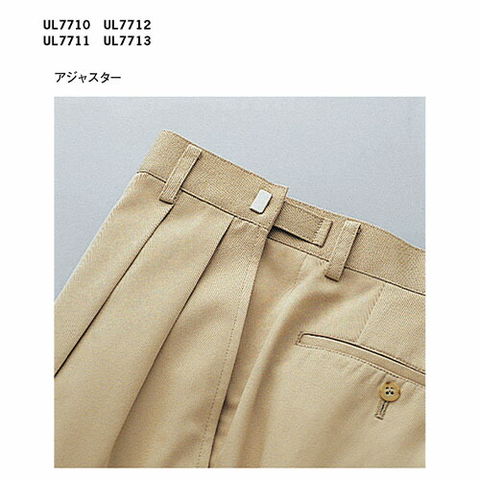股上深め、ツータック、脇にはアジャスター付きの男性用チノパンツ。年齢問わず安心して着用出来ます。シルエットはワイドめ、ゆったりと着用出来ます。こちらは全サイズ股下78cmに加工されています。制電入り。同じチノパンで裾上げ加工されていないものもあります。UL7710、股下85cmフリーで用意されていますので、自分の股下に合わせて加工することが出来ます。