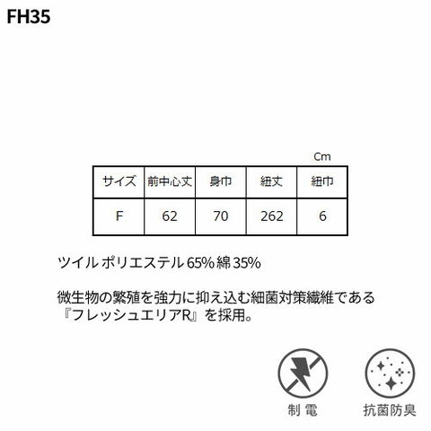 | ツイル(厚手)ポリエステル 64% 綿 35% 複合繊維(ポリエステル)1%微生物の繁殖を強力に抑え込む細菌対策繊維である『フレッシュエリアR』を採用。 |