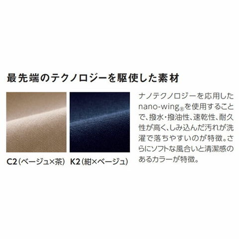 ナノテクノロジーを応用したnano-wingを使用することで、撥水・撥油性、速乾性、耐久性が高く、しみ込んだ汚れが洗濯で落ちやすいのが特徴。さらにソフトな風合いと清潔感のあるカラーが特徴。
