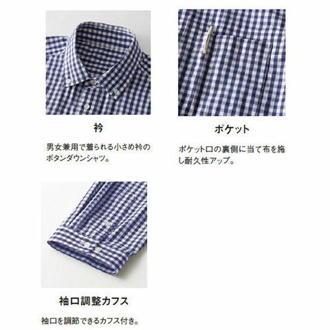 | 着こなしやすいベーシックな先染めのボタンダウンシャツ。七分袖丈、男女兼用で着られる小さめの衿がポイント。左胸にはパッチポケット、袖口カフスはサイズ調節できるダブル釦付き。ギンガムチェックはブラックとネイビーの2色です。●男女兼用のSS、Sサイズはレディス用、Mサイズ以上はメンズ用。 |