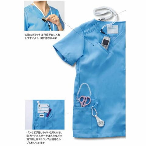 | 右胸ポケット PHSが出し入れしやすい仕様で、物が落ちにくい位置と形に設定 左胸ポケット ペンがサッと差せ、安定する仕切り付き 右腰ポケット 小物が整理しやすい仕切り付きポケット。いろいろなものが掛けられるループ付き 着脱スムーズ 右肩開閉はスナップボタンで着脱が楽ちん |